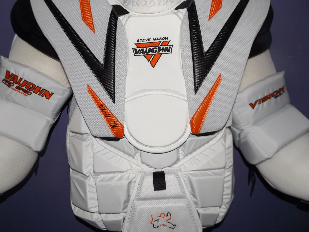 This week's ProHockeyStock.com gear of the week features Philadelphia Flyers goaltender Steve Mason and his brand new, custom Vaughn Vision chest protector. This chesty is a size XL, comes in custom Flyers colors and features NHL goalie gear supervisor Kay Whitmore's signature of approval. This piece of gear can be yours for $625. To learn more about this product or to purchase click here.